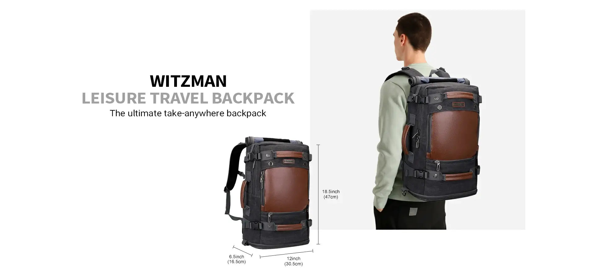 Looking for a compact, stylish bag that works for any situation? The Witzman Convertible Canvas Backpack is designed for versatility. With premium canvas and PU leather, it transforms easily from a backpack to a shoulder bag or tote. Stay organized with multiple compartments, including a laptop pocket for devices up to 16 inches,and shoe . Padded, breathable straps ensure comfort, while the discreet back pocket secures your valuables.